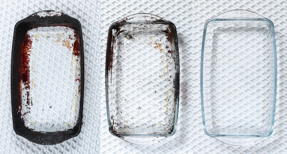 Am zuverlässigsten ist eine Kombination aus Einweichen in heißem Spülwasser und einer Natron-Paste. Erst einweichen (30–60 Minuten), dann Natron auftragen, einwirken lassen und sanft abreiben. Bei sehr hartnäckigen Stellen den Vorgang wiederholen statt stärker zu kratzen.